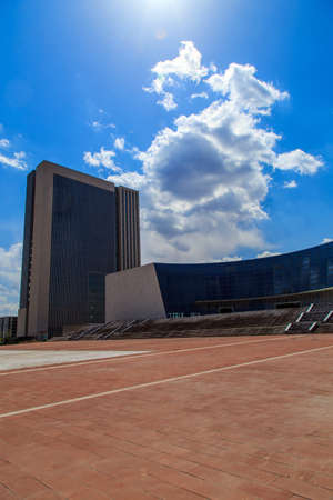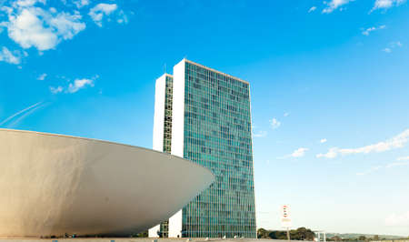 Brasilia, Brazil - June 3, 2015: Brazilian National Congress. The building was designed by Oscar Niemeyer in the modern Brazilian style.