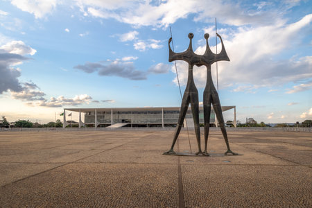 Candango or Warriors Sculpture at Three Powers Plaza with Planalto Palace on background - Brasilia, Distrito Federal, Brazil