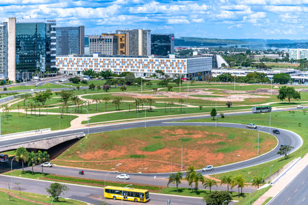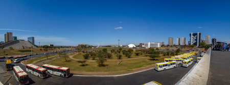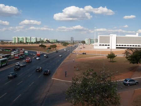 Brasilia, Brazil - July 24 2009: A main avenue in Brazilia called Eixo Monumental. Transportation in Brazil, bus and buildings.