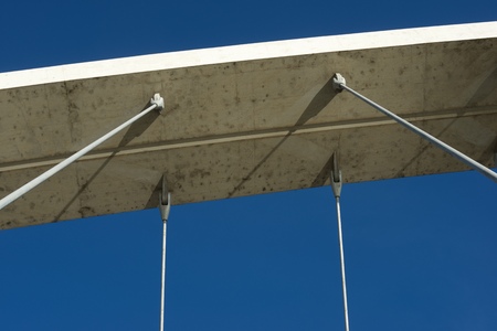 Close-up of modern bridge arch with clean lines, set against a clear blue sky, symbolizing progress.