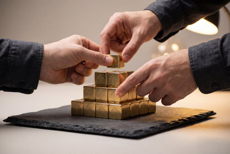 Two pairs of hands meticulously arrange golden rectangular blocks into a pyramid shape on a dark slate surface, symbolizing construction and collaboration
