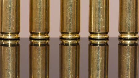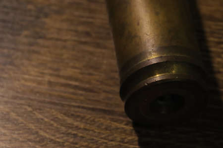 brass rifle shells 5.56 x 45 cartridges on a wooden board