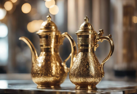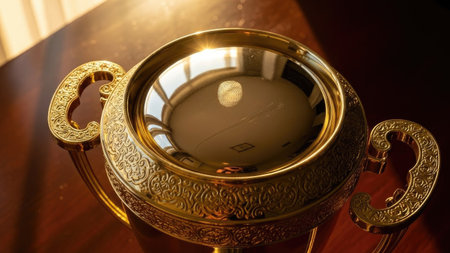 A Golden Vase Sitting On Top Of A Wooden Table. Generative AI