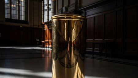 Cinematic Wide Shot (16:9) capturing a monumental, highly polished brass pedestal within the vast, m