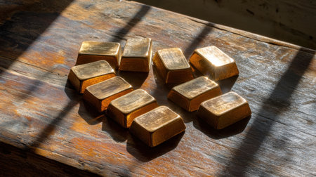 A captivating arrangement of gold bars rests on a rustic wooden surface, with sunlight casting dramatic shadows and highlighting the shiny texture of the metal.