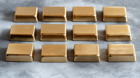 A stylish arrangement of shiny gold bars lying on a smooth gray surface. This image embodies modern elegance, perfect for luxury themes.