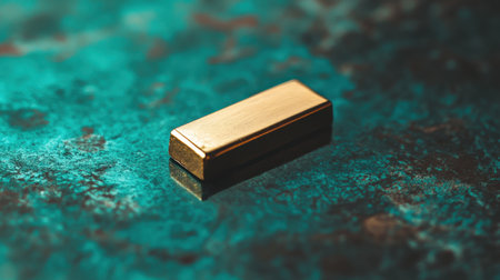 This image features a gold bar resting on a rich teal surface, illuminated by soft lighting that casts elegant shadows and reflections, perfect for luxury themes.