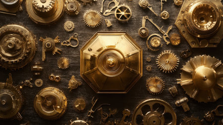 Explore a captivating collection of vintage gold gears and mechanical components elegantly arranged on a dark wooden background, showcasing intricate craftsmanship.