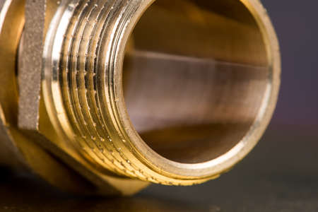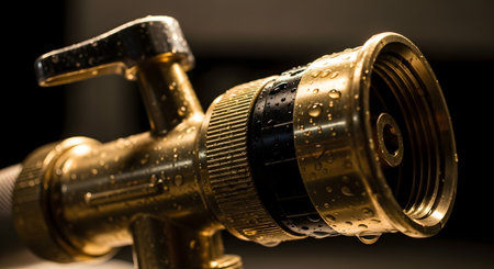 A macro, close-up shot of a brass garden hose nozzle, covered in water droplets. The shiny metal and intricate threads are highlighted against a dark background, suggesting gardening or water pressure.