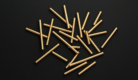 A few golden metal rods scattered on a black background, top view, high-resolution photography, high detail, minimalism, 3D rendering. --ar 26:15 --v 6.1 Job ID: f3a79dd8-313a-4a56-a1c9-9532dca82b83