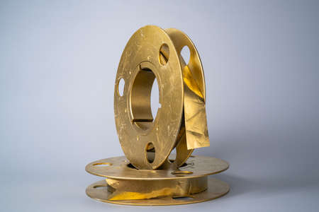 Old scratched gold reel with audio or video tape on a gray studio background. Bobbin, retro magnetic spool. Round reel for analogue projector or sound record. Videotape, filmstrip.