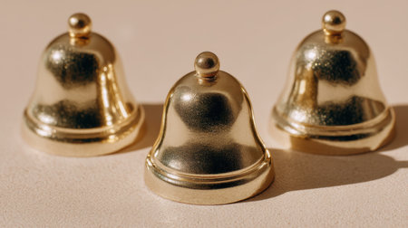 Three golden bells arranged neatly on a smooth surface, reflecting light beautifully. Ideal for themes of celebration, joy, or event planning inspiration.