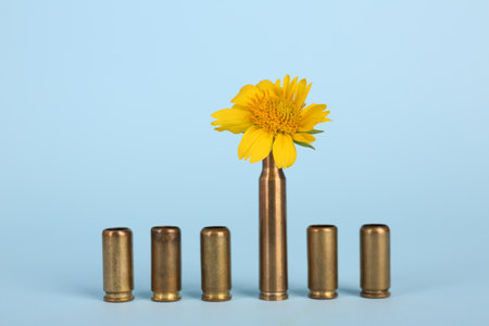 Bullet cartridge cases and beautiful yellow flower on light blue background