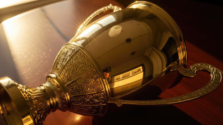 A highly detailed, ornate golden chalice sits on a reflective surface against a dark, moody background.
