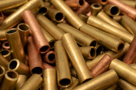 brass bronze copper alloys plates bars pins stock hole tubing thong sheet for knife handle knife making materials supply on the brown wooden background