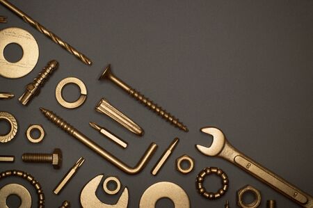 Template of golden tools on gray background for industry projects or mechanics topics.