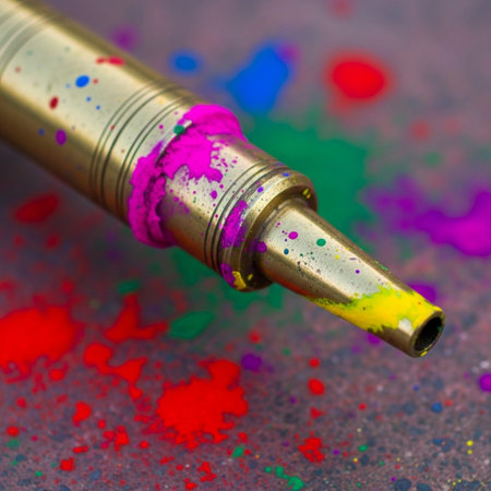 A tipped ink bottle surrounded by splattered ink blots in vibrant shades of purple and blue.