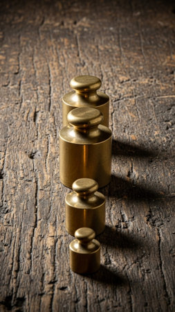 Vertical still life of highly polished vintage brass measuring weights arranged symmetrically on a rustic, aged wooden workbench, symbolizing precision and labor.