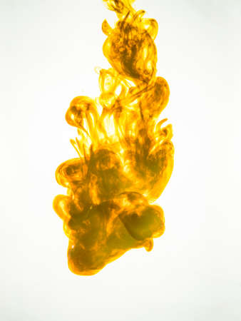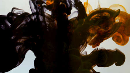 Black and orange watercolor ink in water on a white background. Black and orange cloud of ink on a white background. Abstract background. Drops of black and orange ink in water. Colored acrylic paints in water.