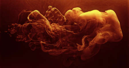Ink water drop. Color fluid shot. Inferno energy. Blast flame. Orange red golden paint mist cloud flow on dark abstract background.