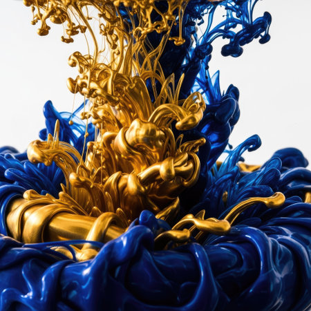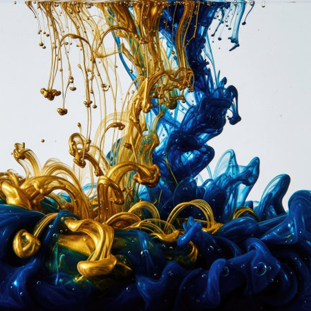 An abstract composition features golden and blue liquids, creating dynamic shapes. The artwork displays a textured appearance with flowing, swirling forms set against a white backdrop. The detailed forms and color contrast suggest potential use in design, decoration, or artistic illustration. The piece's fluid design offers versatility for various creative endeavors.