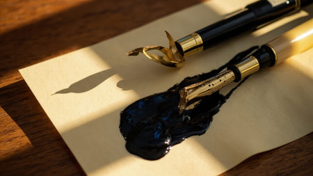 Capture the timeless allure of writing with this elegant still life. Featuring classic fountain pens with spilled black ink cascading onto aged parchment paper, this image evokes sophistication and creativity. Bathed in warm sunlight, the scene showcases intricate details of the ink, nib, and paper texture. Perfect for projects related to writing, literature, history, office, education, or adding a touch of vintage charm to your designs. This image is ideal for use by authors, writers, and anyone looking for a premium, artistic aesthetic.
