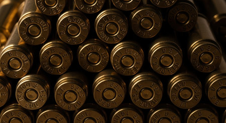 A close up view of numerous brass bullet casings stacked in a pyramid shape, showing the detailed markings on the base of each cartridge.