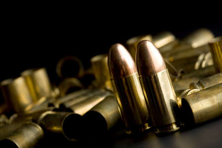 bullets on black, full 9mm rounds and spent casings, macro with focus on front round
