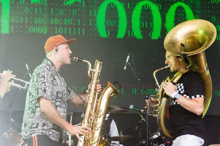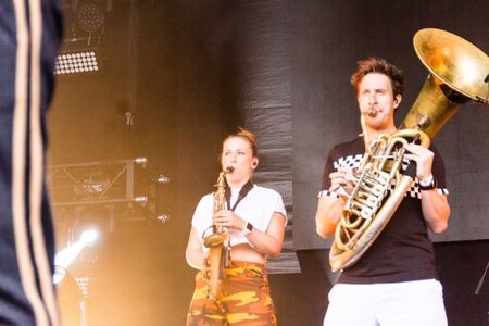 Kiel, Germany - June 26th 2019: The Brasspop-Band Querbeat from Cologne is performing on the Rathaus Stage during the 125th Kiel Week