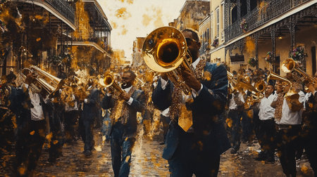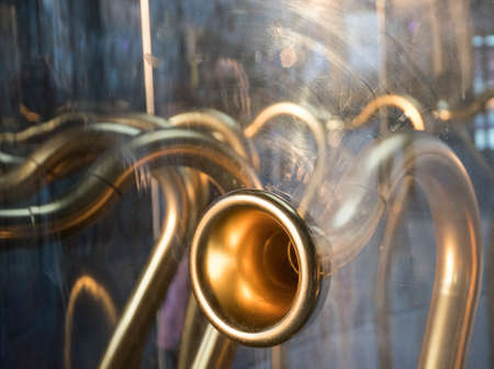 Brass instruments reflected on a golden surface