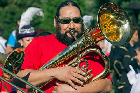 Romania, Timisoara - JULY 7, 2016: Man singer at trombone from Chile, present at the international folk festival, International Festival of hearts Organized by the City Hall Timisoara.