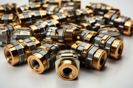A stunning close-up image of various metal nuts and bolts displayed on a reflective surface, showcasing the intricate details and textures of industrial hardware components.