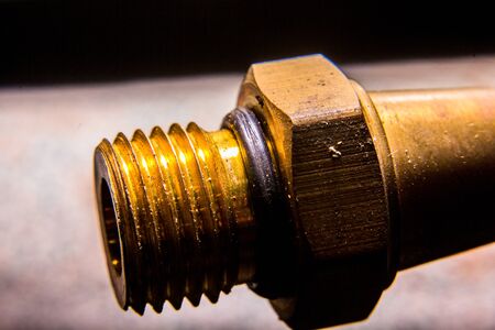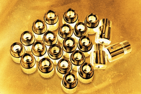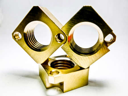 brass metal 3 pieces of golden light lined up and overlapping with threads inside. It is a piece of machinery in the industry.