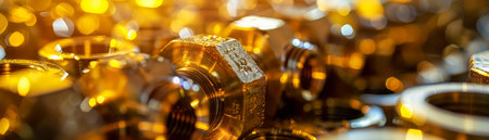 A captivating display of polished brass mechanical components arranged artfully on a soft golden background; perfect for industrial or artistic themes.