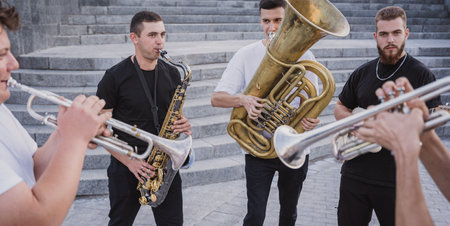 Young street music band play a lot of musical instruments