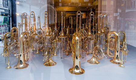Lot of trumpets showed in shop in London