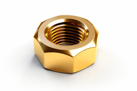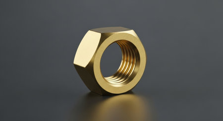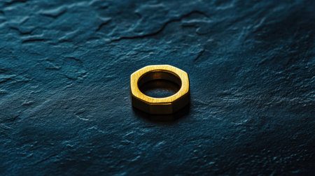 This image features a golden hexagonal nut set against a dark textured surface, showcasing intricate details and design suited for industrial themes.