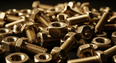 This close-up image features a shiny golden nut at the center, surrounded by silver bolts against a dark textured surface, perfect for industrial themes.