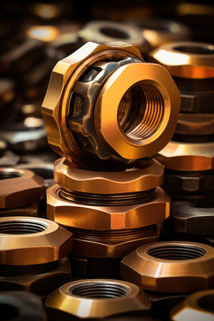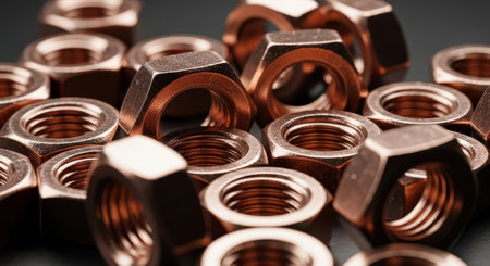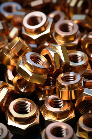 A close up view of a pile of shiny copper colored hexagonal nuts, showcasing their detailed threading and metallic texture. Ideal for industrial, construction, and engineering themes.