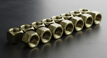 A row of golden brass hex nuts with a slightly aged patina, precisely arranged on a dark, reflective surface, showcasing intricate threading and metallic texture.