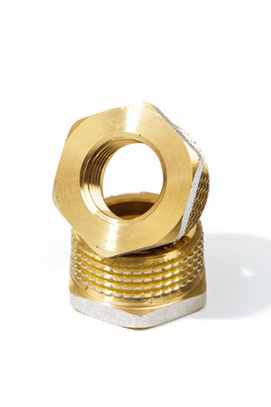 brass metal 3 pieces of golden light lined up and overlapping with threads inside. It is a piece of machinery in the industry.