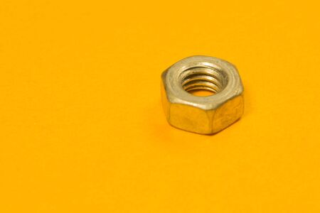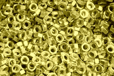 A lot of hexagonal nuts. Mechanical fasteners with a threaded hole, close up