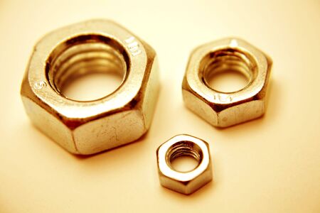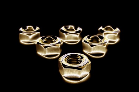 Metallic nuts. Low-key concept picture taken in studio with soft-box and dark background representing some mechanical components.