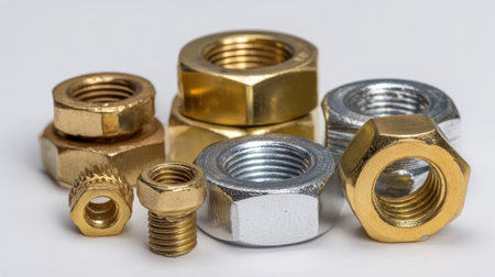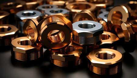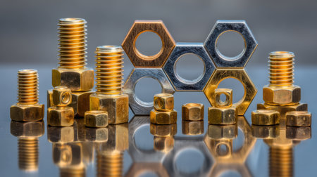 A stunning close-up image of various metal nuts and bolts displayed on a reflective surface, showcasing the intricate details and textures of industrial hardware components.