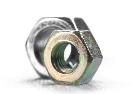 Metal nuts made of steel. Hexagon nuts scattered on white background