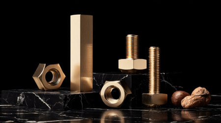 This captivating image showcases assorted golden hardware, including bolts and nuts, arranged artfully on a polished black marble surface, complemented by natural elements such as walnuts.