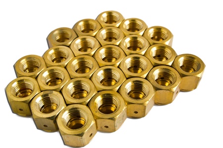 High detail close-up macro of four arranged gold screw nuts isolated on white background in partial focus