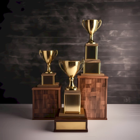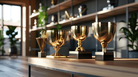 Golden trophy awards shine on light brown wooden tables, representing success and achievement.