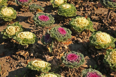 Top view of colorful and beautiful ornamental cabbages. Various decorative cabbage.