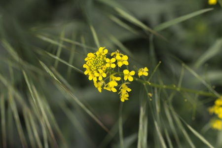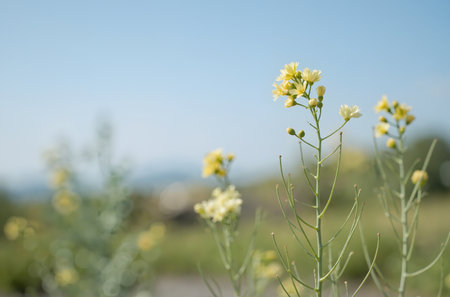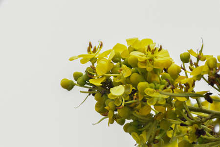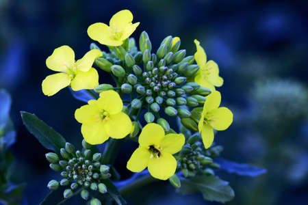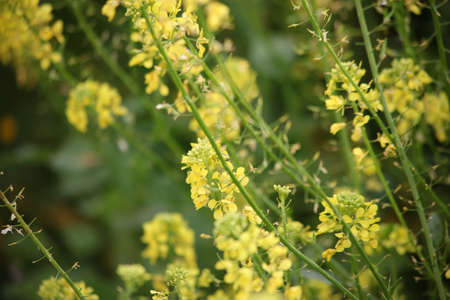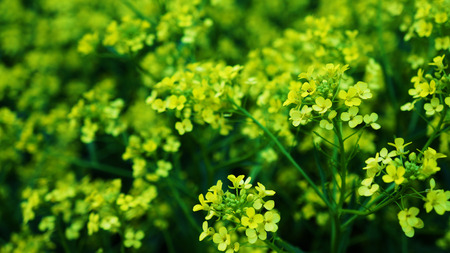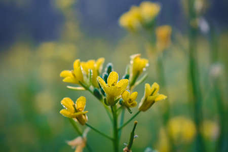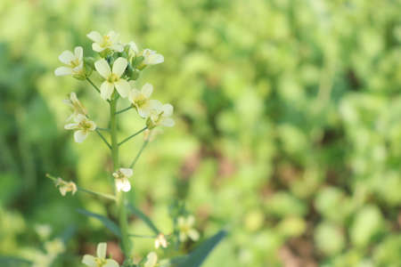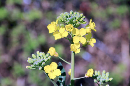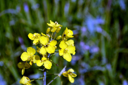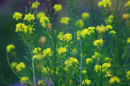 Yellow flowers of turnips with the background out of focus. Copy space.